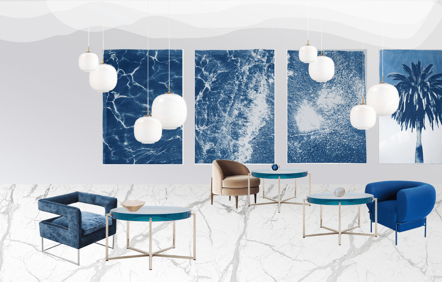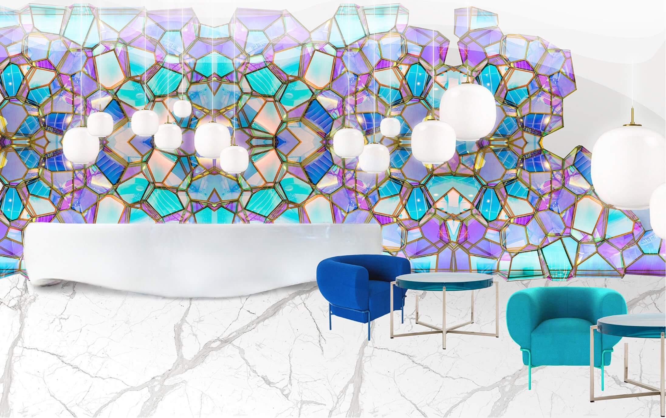 Цветовая гамма проекта вдохновлена фильмом Клюзо и Перрена «Океаны» — магнетический синий в сочетании с пастельными оттенками и неоново голубым создают роскошную палитру для пространства музея.